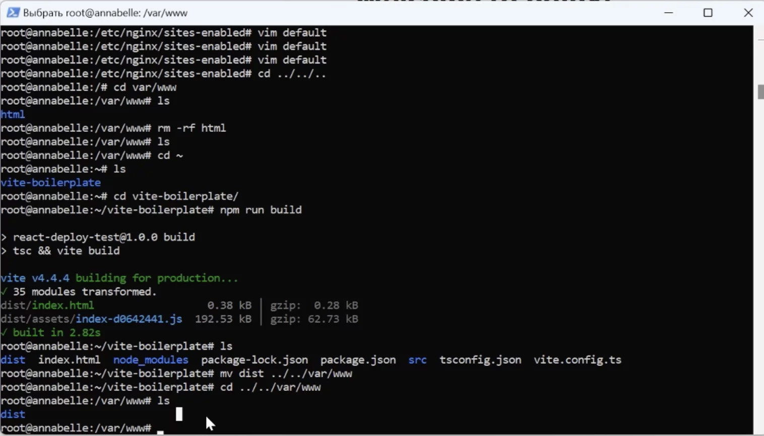 Let’s discuss again how nginx determines which files to serve. In the var/www/html directory, specify the path to the project’s folder. Let’s change it to var/www/dist. Dist is the folder where our frontend application is compiled.