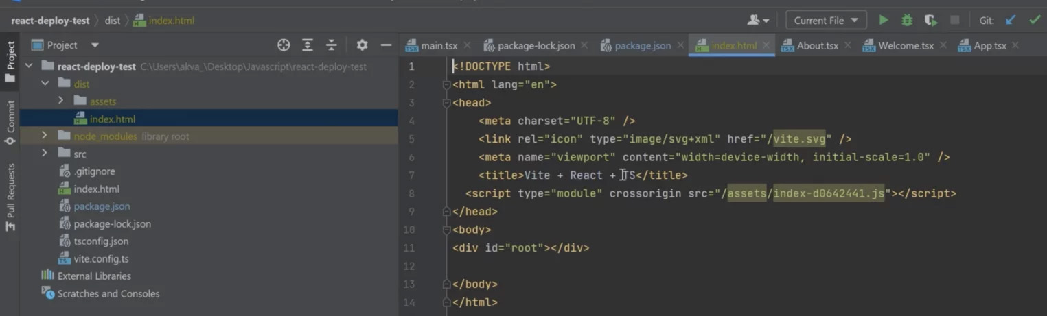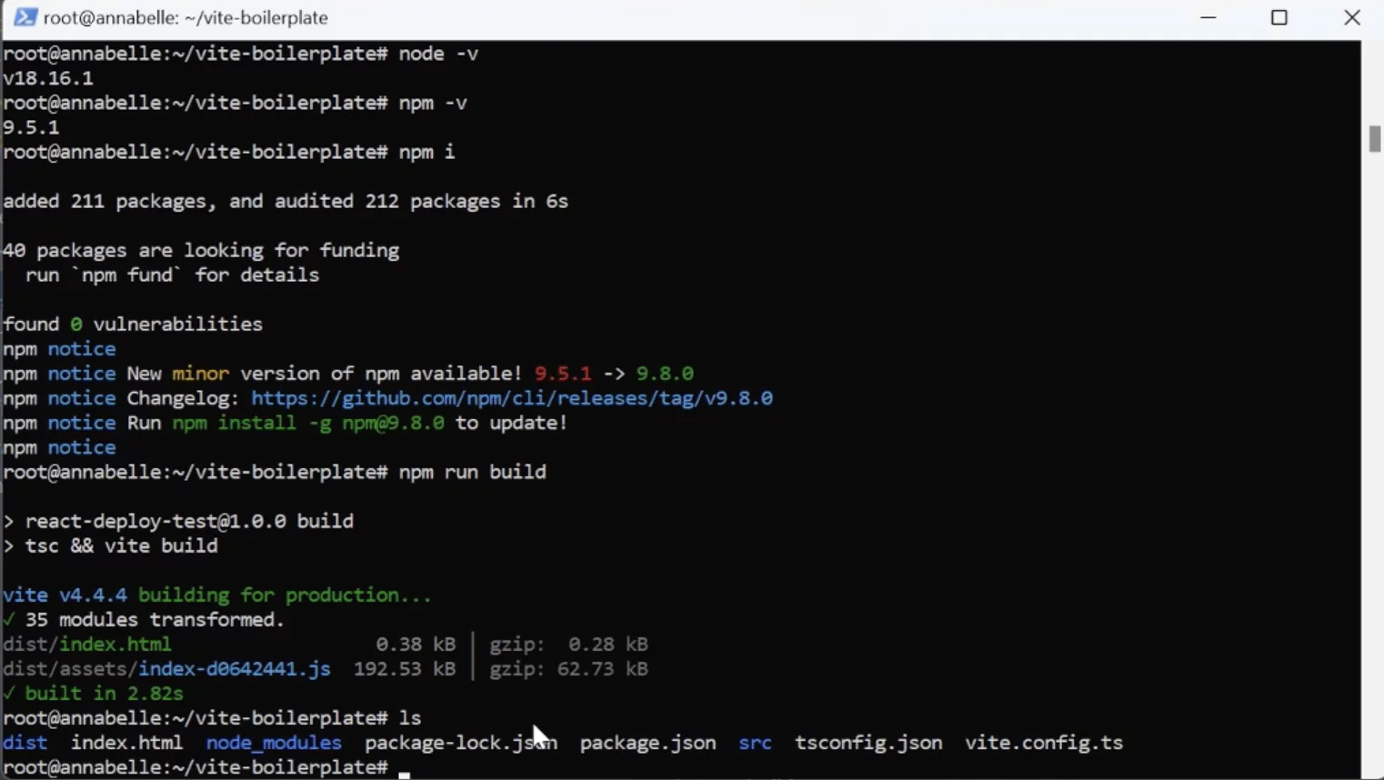 We will now deploy the same build on a remote server. Type “npm run build” and wait for the build to complete successfully. If you enter the ls command, you’ll see the dist folder containing all necessary files inside.