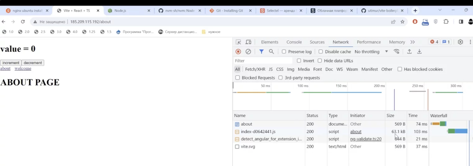 Now let’s attempt to reduce the bundle size. If the application is large and weighs around 5-7 MB, optimize it through code by splitting it into chunks, using Lazy Loading, etc. Additionally, you can optimize the size using nginx’s gzip module. For gzip to function, uncomment these lines in nginx’s root configuration: