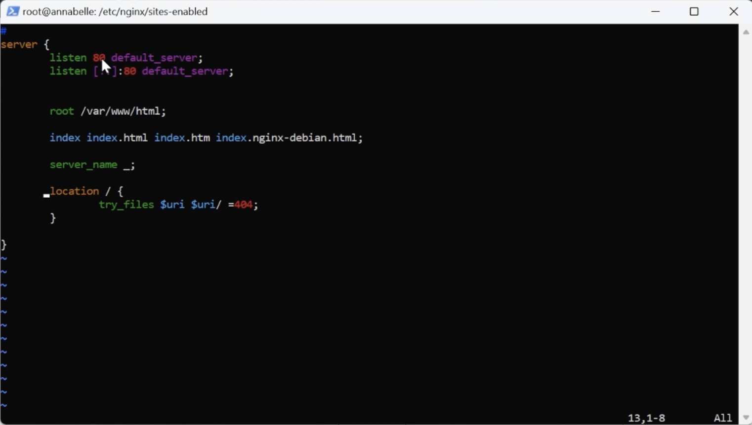 Now let’s move to the “sites enabled” folder where the include was directed. Find the “default” file and open it with Vim. There are numerous comments here that should be removed to avoid distraction.