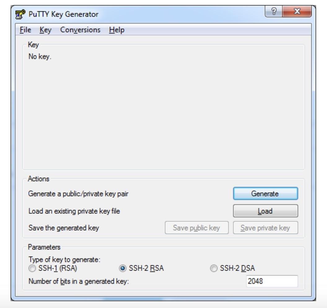 Select the SSH-2 RSA key type with a 2048-bit length, then click “Generate”.