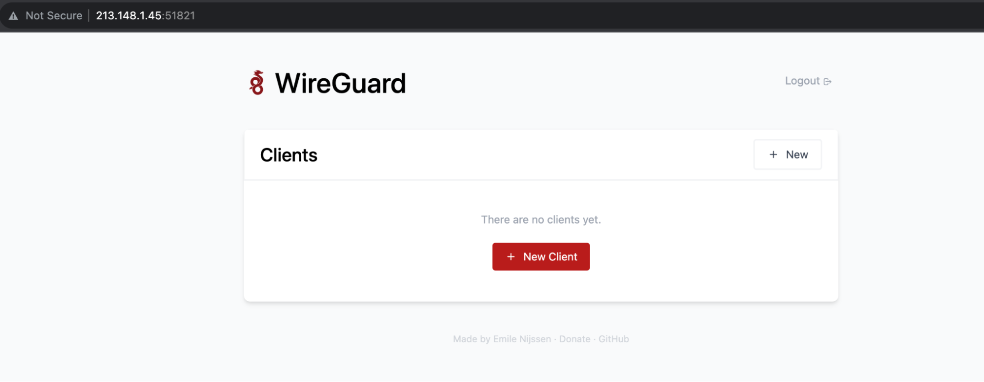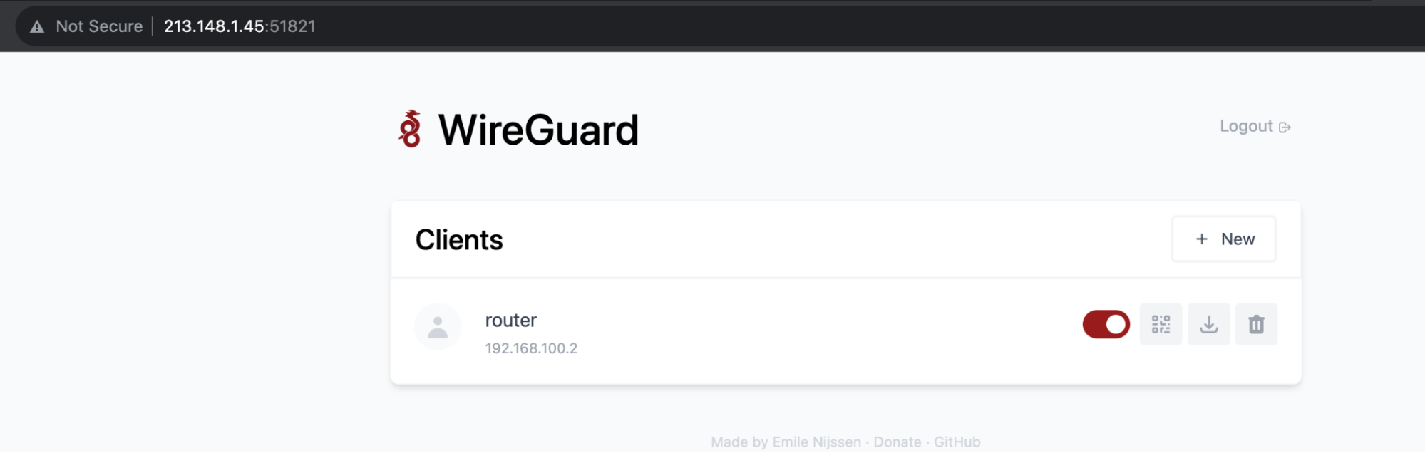 Теперь откройте веб-интерфейс по адресу http://server_IP:51821 и авторизуйтесь, используя заданный пароль. Далее необходимо создать новый клиент и скачать файл конфигурации.
