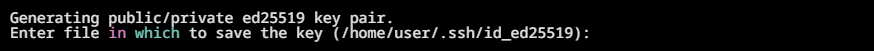 Система предлагает сохранить ключ в стандартном каталоге ~/.ssh/. Это домашняя директория текущего пользователя (например, /home/user/.ssh/id_ed25519).