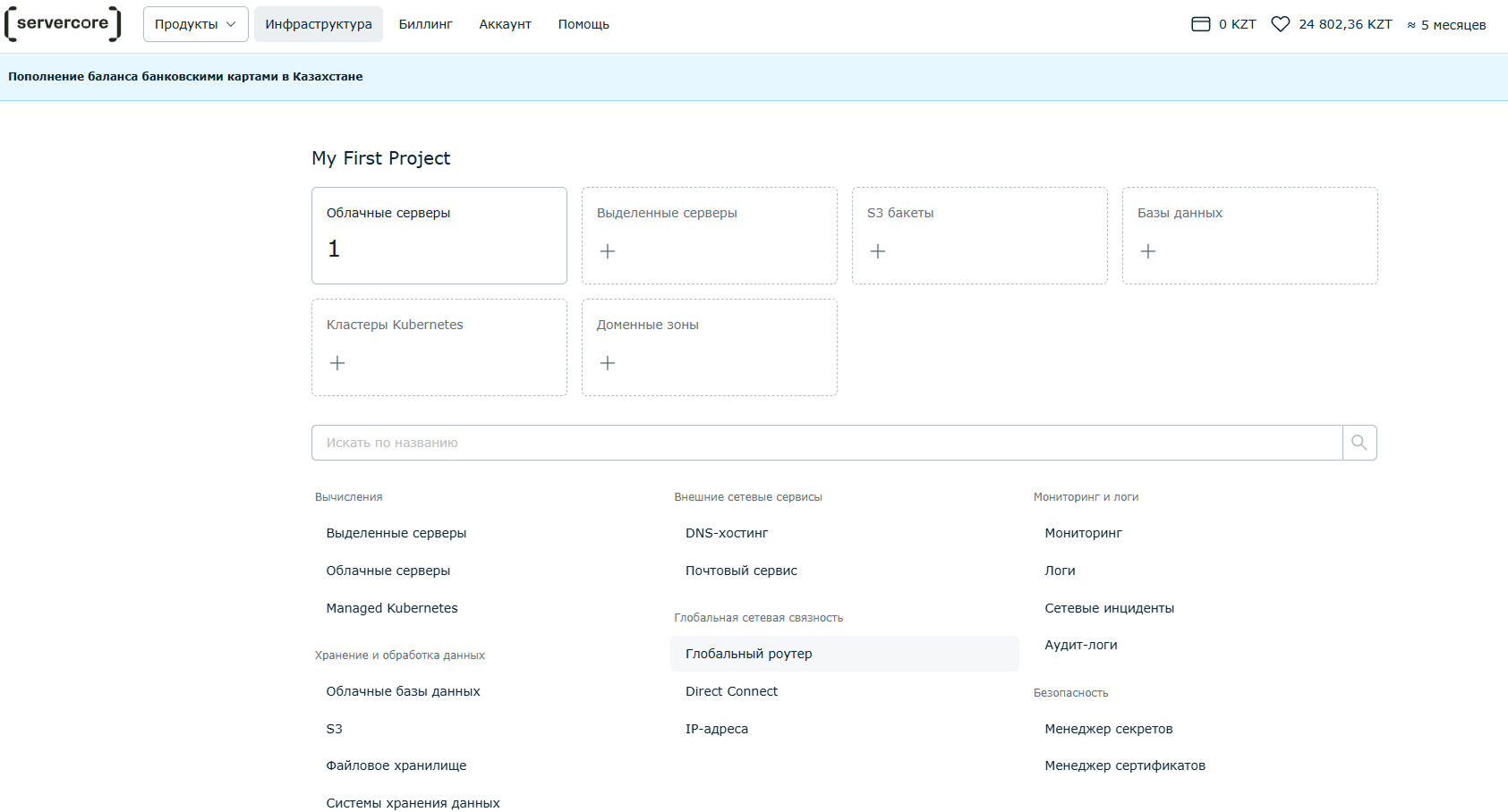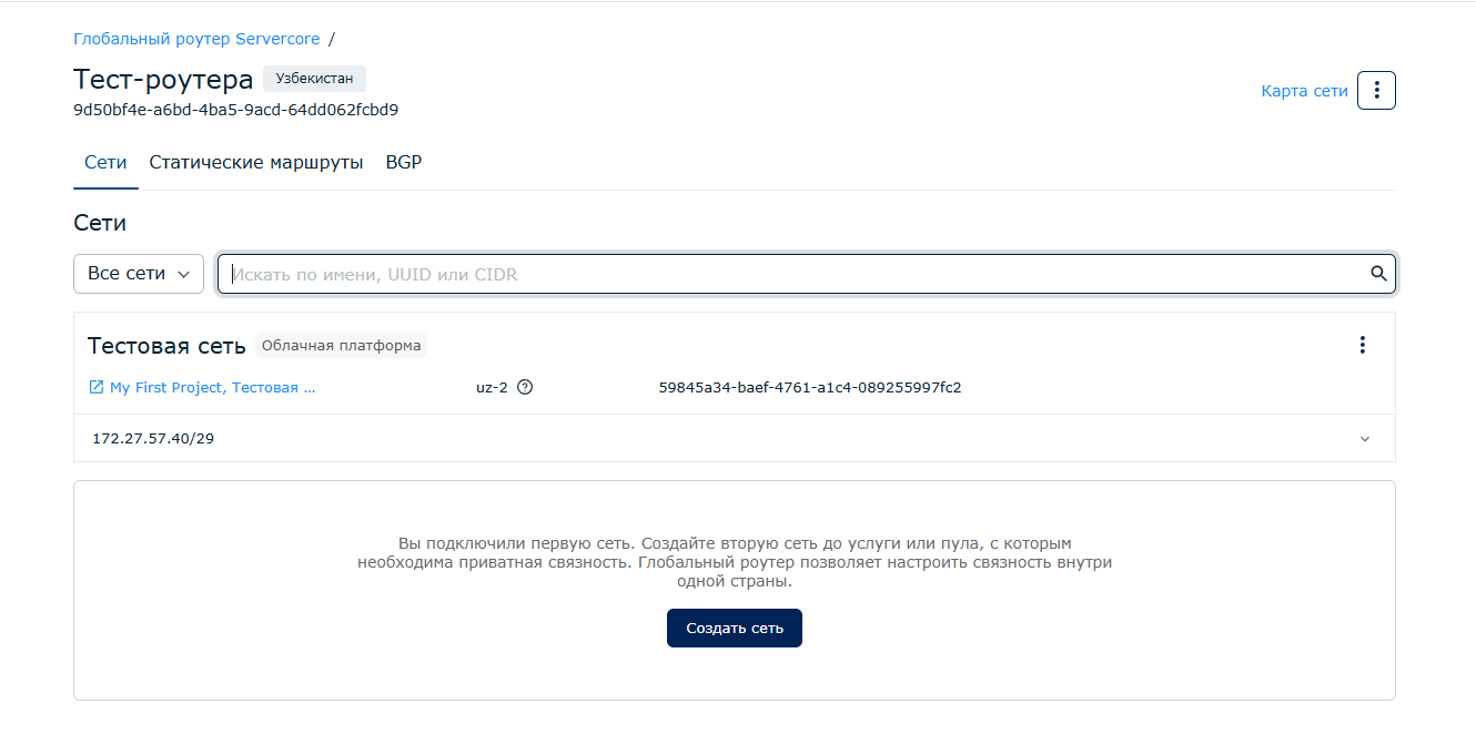 Также на стороне Servercore нужно убедиться, что создание проекта завершено и у вас есть права на управление глобальным роутером.