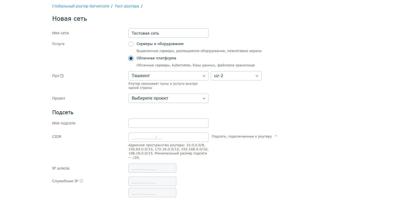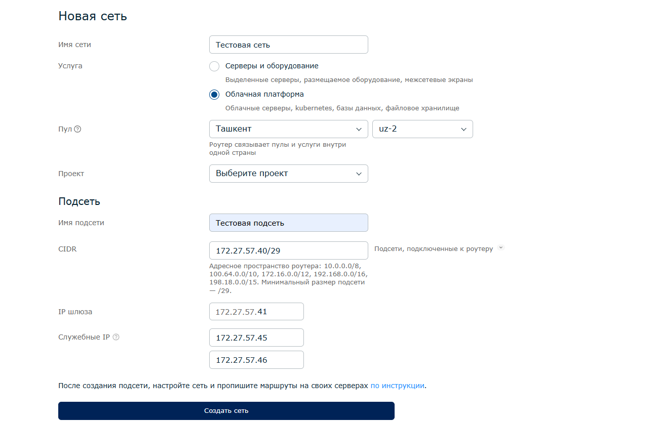 Обязательно выберите «Облачная платформа». Далее сами введите имя сети, установите пул и проект для сети.