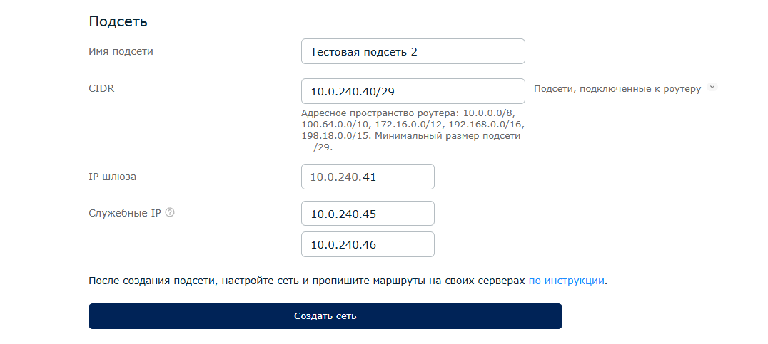 Далее пропишите сеть 10.0.240.40/29. Автоматически добавится шлюз 10.0.240.42 и нужные IP. Нажмите «Создать сеть».
