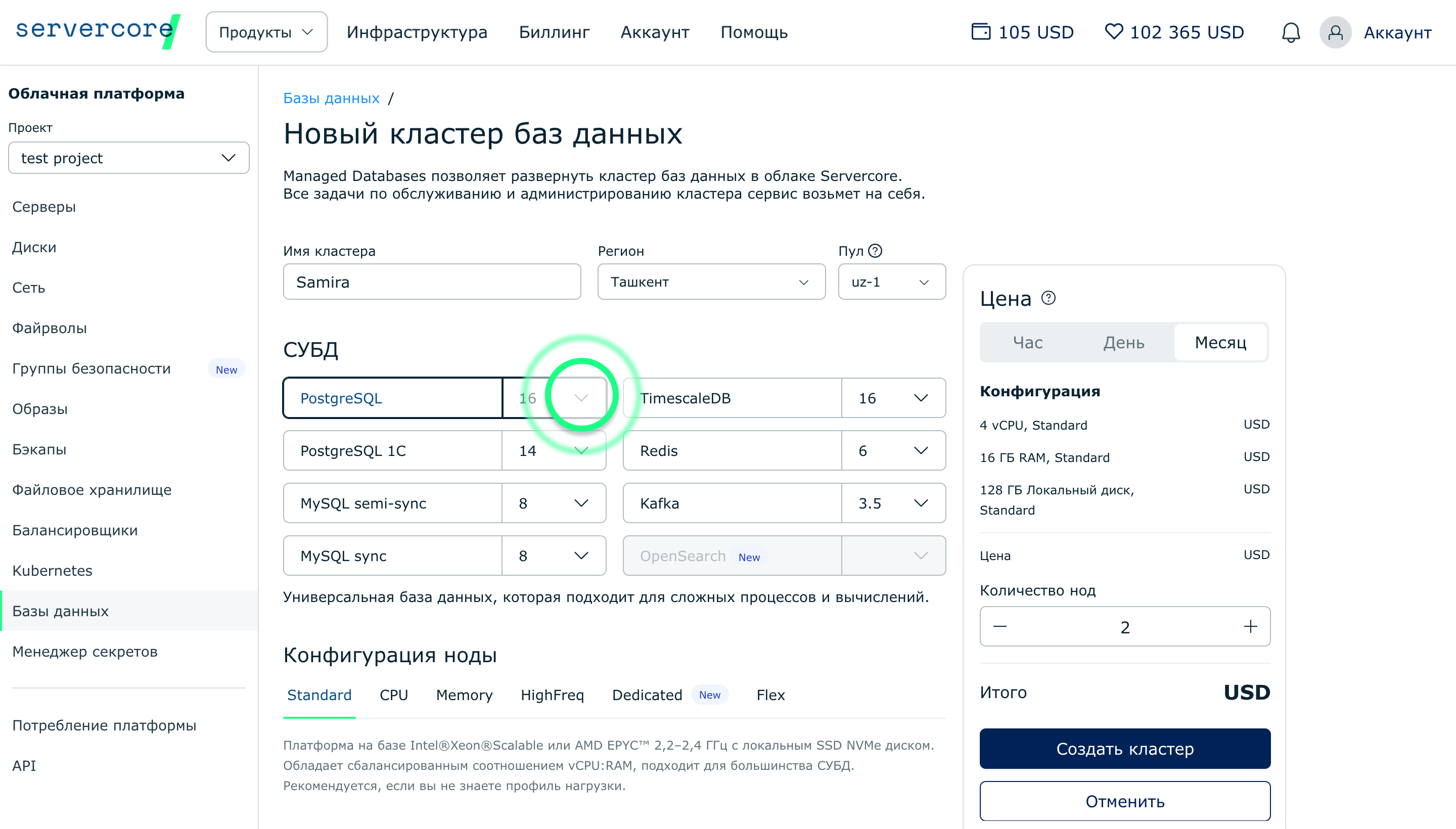 Цена сервиса зависит от потребляемых ресурсов: количества виртуальных ядер процессора (vCPU), оперативной памяти (RAM) и дискового пространства. Точную стоимость можно рассчитать в панели. Оплата Managed PostgreSQL производится по фактическому использованию, то есть в зависимости от количества использованных ресурсов (по модели pay-as-you-go).