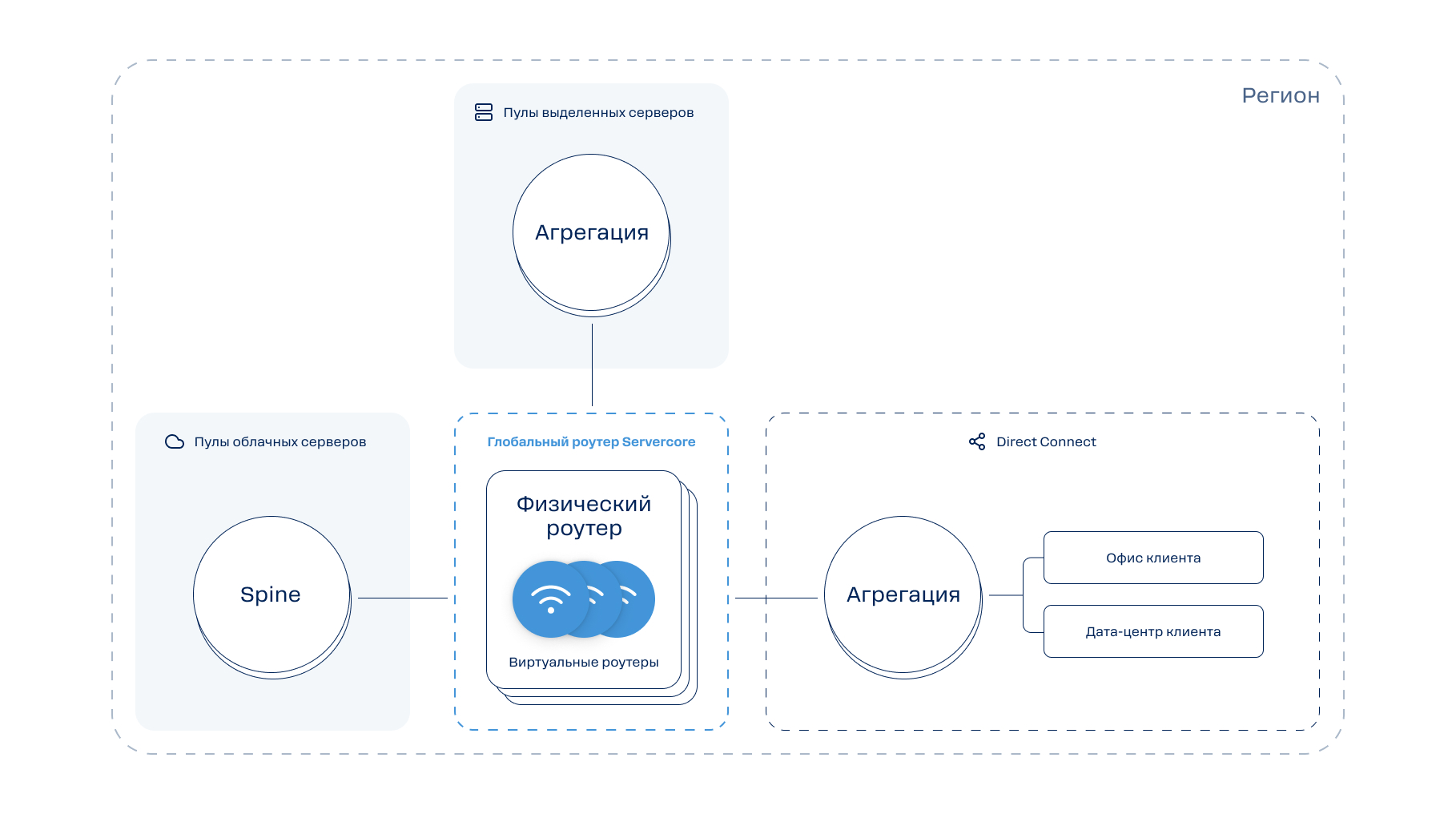 Глобальный роутер объединяет различные сегменты клиентских локальных сетей в одну изолированную сеть. В этой сети закрепляются IP-подсети, соответствующие каждому сегменту, и происходит маршрутизация трафика.