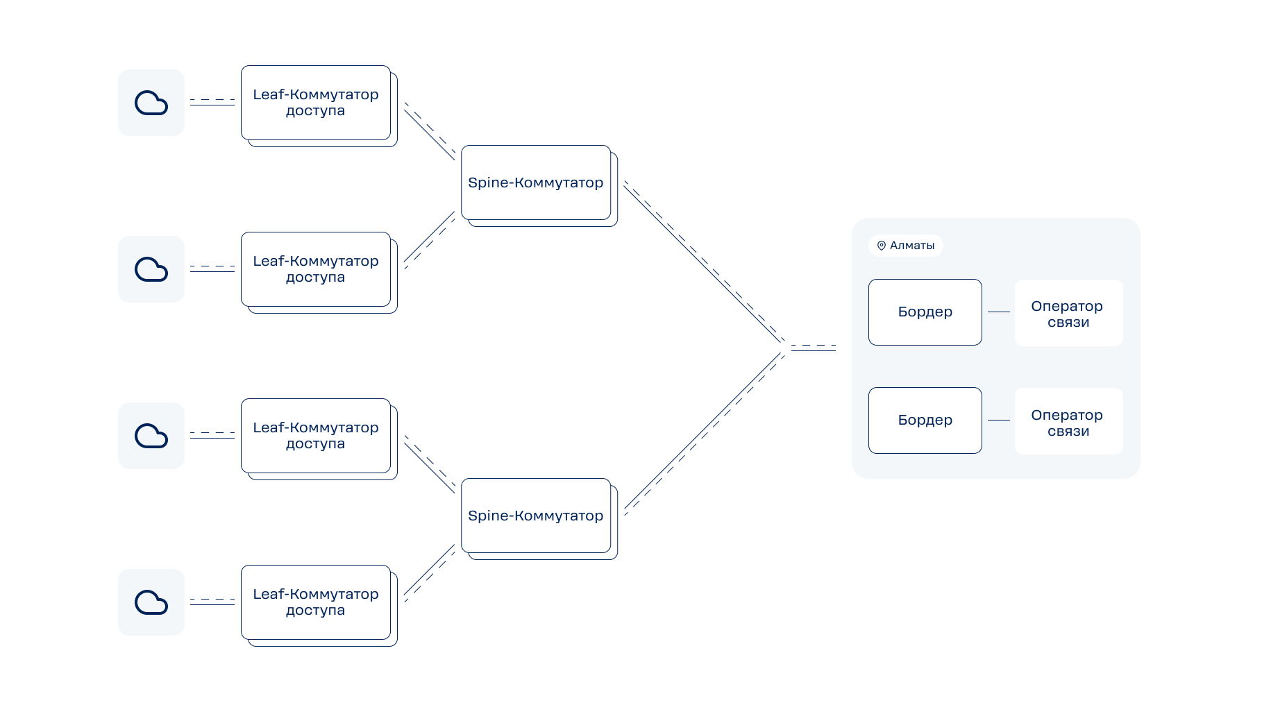 Соединяют между собой leaf-коммутаторы и позволяют физическим узлам облака, подключенным к разным leaf-коммутаторам, обмениваться трафиком. Все соединения между leaf- и spine-коммутаторами зарезервированы. Каждый leaf-коммутатор подключен минимум к двум разным spine-коммутаторам.3. Пограничные маршрутизаторы доступа (бордеры)
